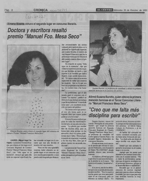 Doctora y escritora resaltó premio "Manuel Fco. Mesa Seco" [artículo] Miguel Angel Venegas.
