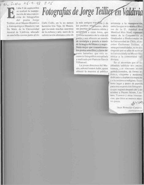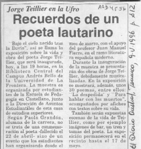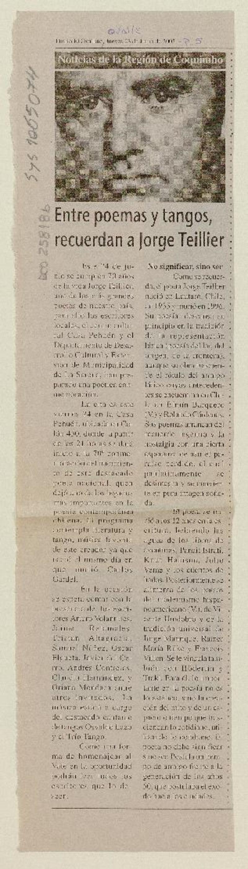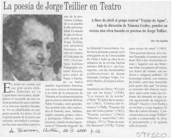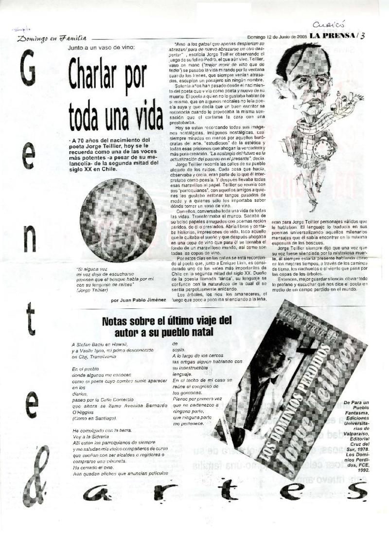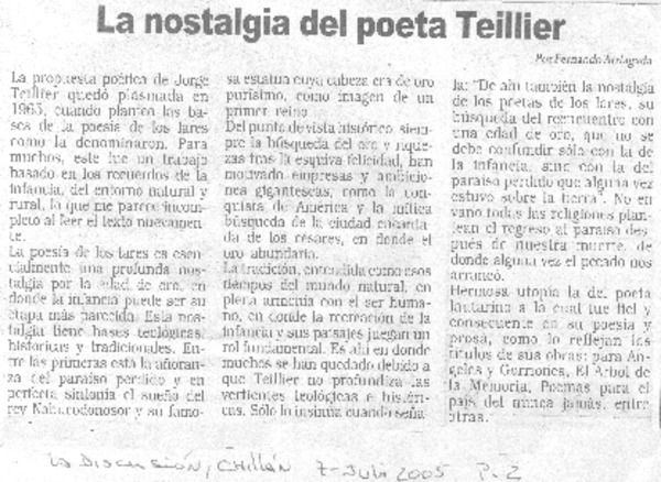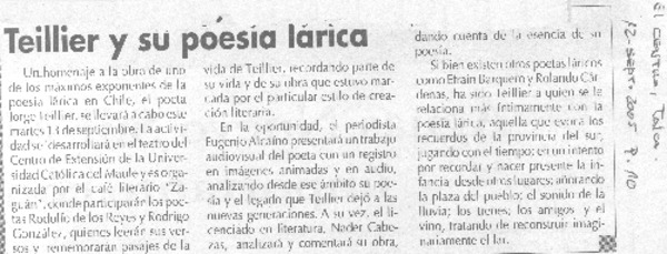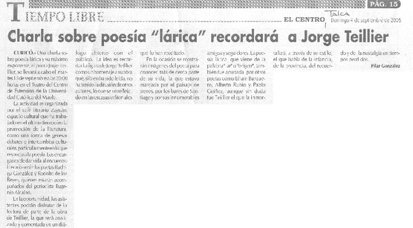 Charla sobre poesía "lárica" recordará a Jorge Teillier. [artículo] Pilar González