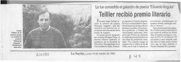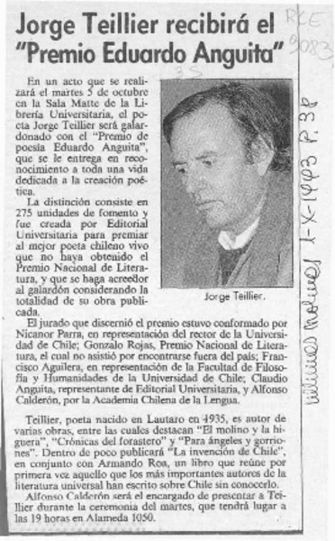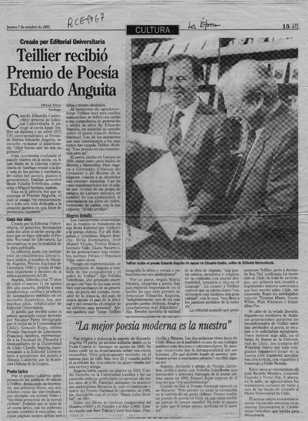 Teillier recibió premio de poesía Eduardo Anguita [artículo] Oscar Vega.