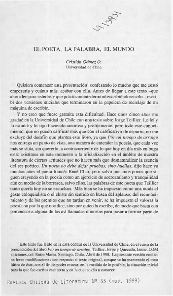 El poeta, la palabra, el mundo [artículo] Cristián Gómez O.