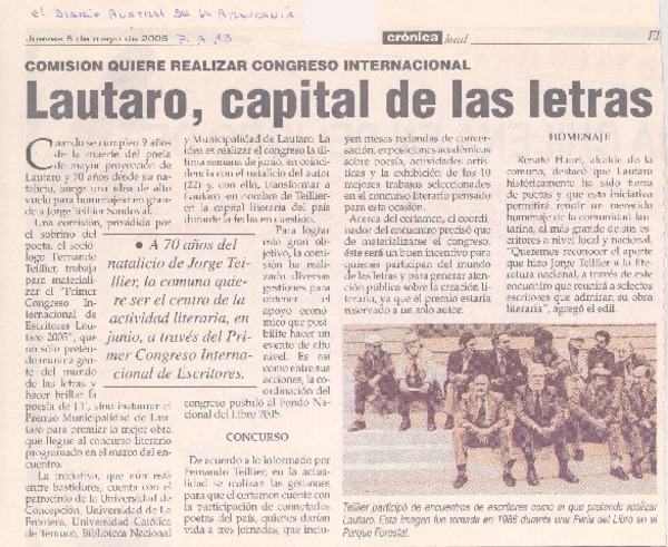 Comisión quiere realizar congreso internacional : Lautaro, capital de las letras [artículo]
