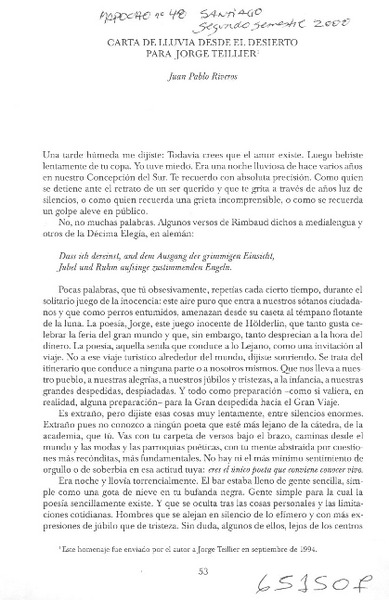 Carta de lluvia desde el desierto para Jorge Teillier [artículo] Juan Pablo Riveros