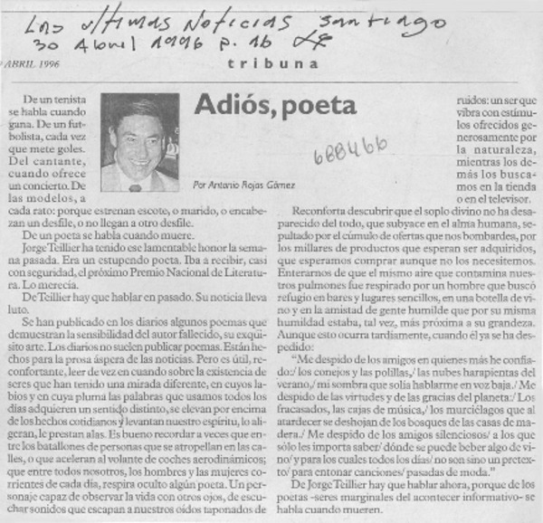 Adiós, poeta [artículo] Antonio Rojas Gómez.