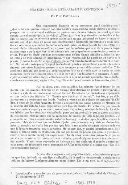 Una experiencia literaria en su contexto [artículo] Pedro Lastra.