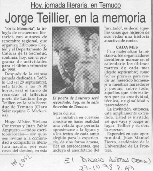 Conmemoran tres años de la muerte de Jorge Teillier [artículo]