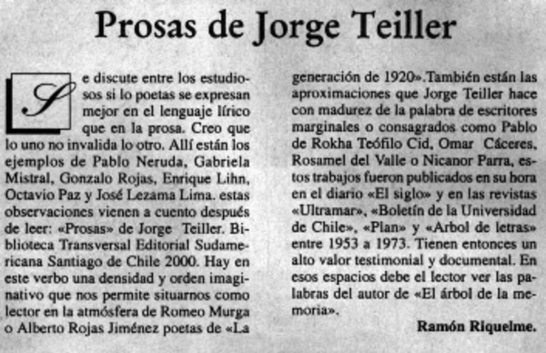 Autores chilenos - Teillier, Jorge - Traverso, Ana - Prosas, de Jorge Teillier