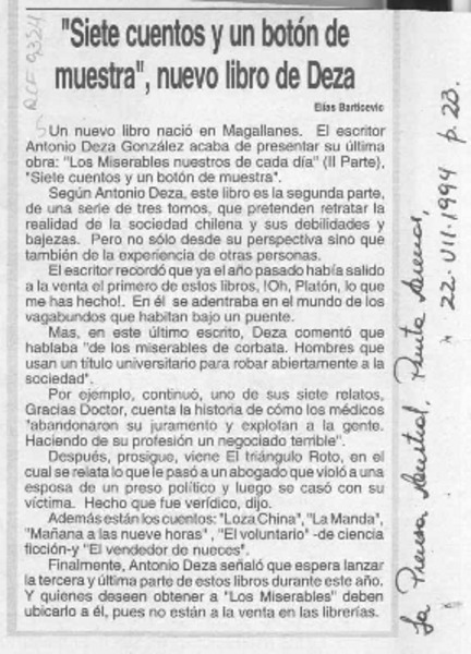 "Siete cuentos y un botón de muestra", nuevo libro de Deza [artículo] Elías Barticevic.