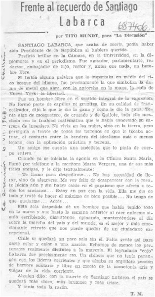 Frente al recuerdo de Santiago Labarca. [artículo] Tito Mundt.