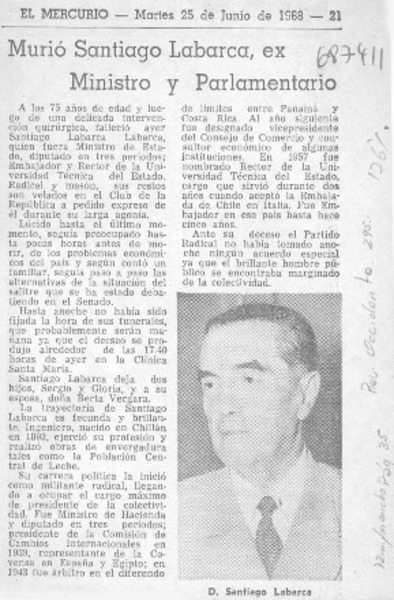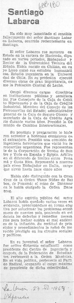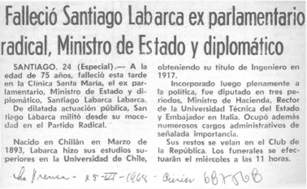 Falleció Santiago Labarca ex parlamentario radical, Ministro de Estado y diplomático. [artículo]