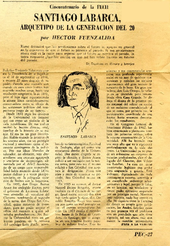 Santiago Labarca, arquetipo de la generación del 20 [artículo] Héctor Fuenzalida.
