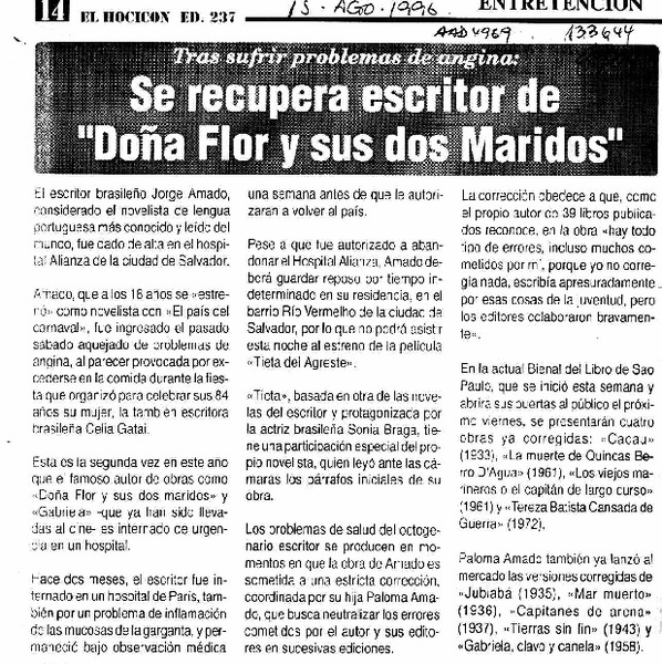 Se recupera escritor de Doña Flor y sus dos maridos" [artículo].