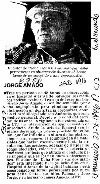 Se estabiliza la salud del escritor Jorge Amado [artículo].