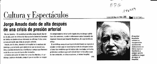 Jorge Amado dado de alta después de una crisis de presión arterial [artículo].