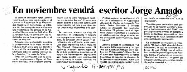 En noviembre vendrá escritor Jorge Amado [artículo].