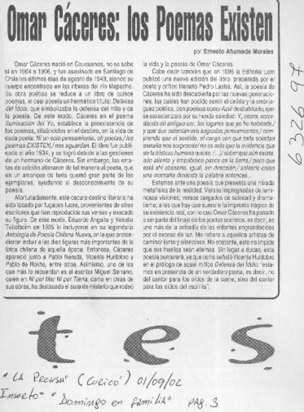 Omar Cáceres, los poemas existen [artículo] Ernesto Ahumada Morales