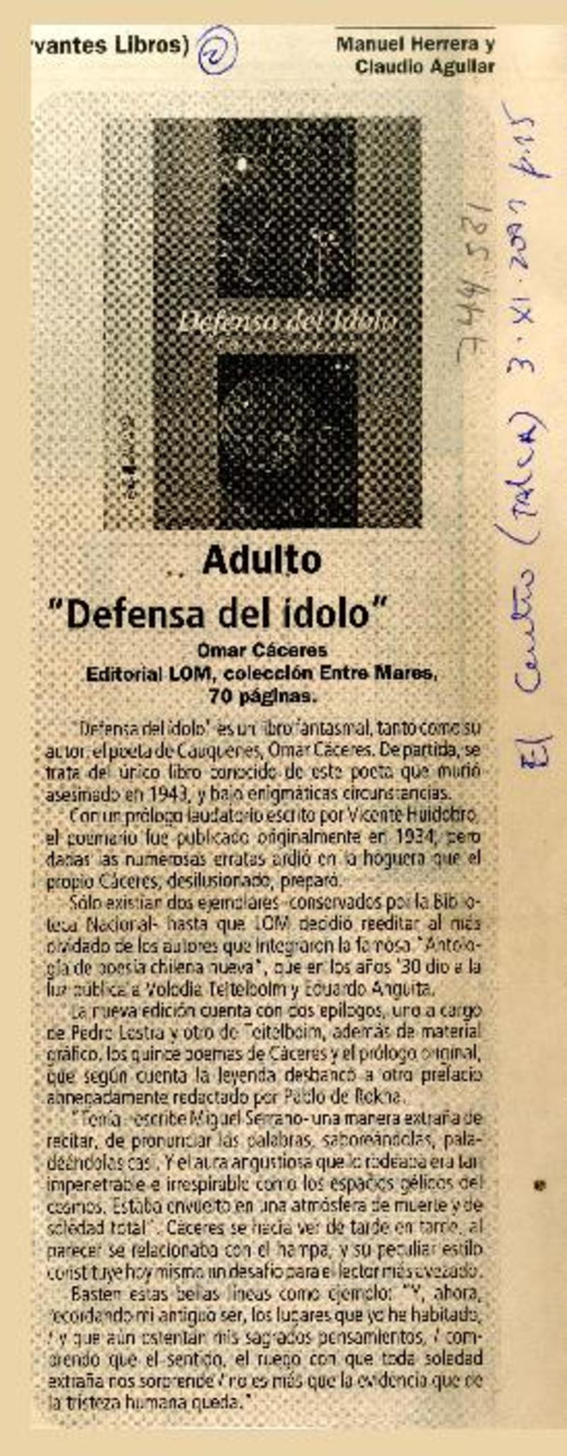 "Defensa del ídolo" [artículo] Manuel Herrera y Claudio Aguilar.