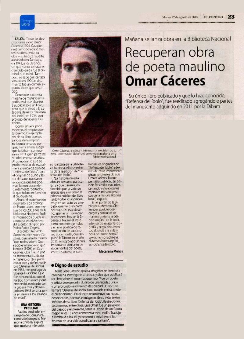 Recuperan obra de poeta maulino Omar Cáceres [artículo] Macarena Muñoz