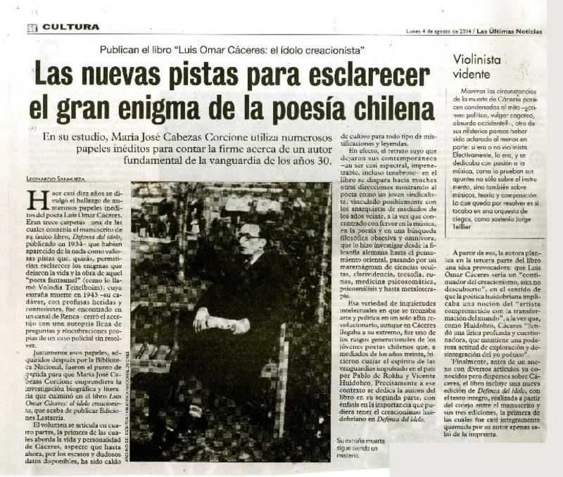 Las nuevas pistas para esclarecer el gran enigma de la poesía chilena [artículo] Leonardo Sanhueza