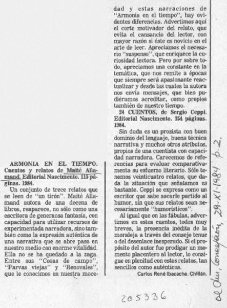 "Armonía en el tiempo", cuentos y relatos [artículo] Marino Muñoz Lagos.