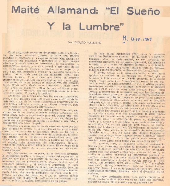Maité Allamand, "El sueño y la lumbre" [artículo] Ignacio Valente.