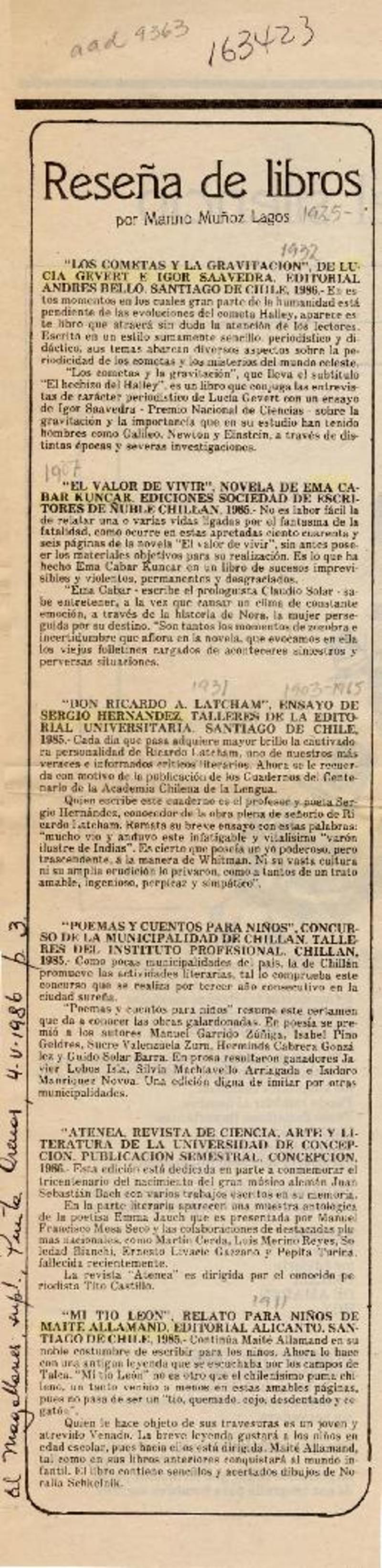 Autoras chilenas - Autores chilenos - Latcham, Ricardo A. - Saavedra, Igor - Cabar Kuncar, Ema - Allamand, Maité - Hernández, Sergio - Gevert, Lucía - Mi tío León - El Valor de vivir - Cometas y la gravitación - Don Ricardo A. Latcham