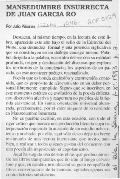 Mansedumbre insurrecta de Juan García Ro [artículo] Julio Piñones.