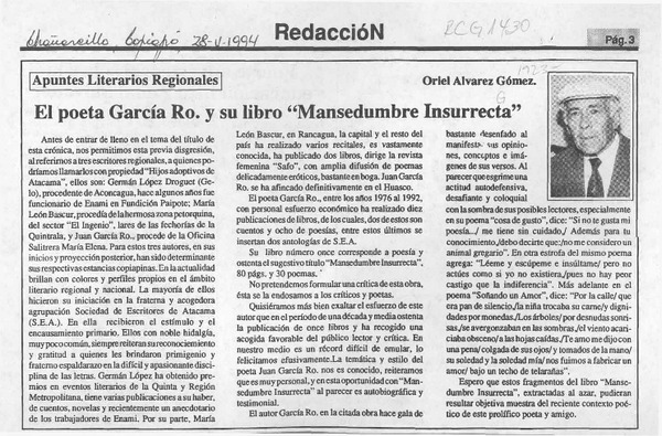 El poeta García Ro y su libro "Mansedumbre insurrecta" [artículo] Oriel Alvarez Gómez.