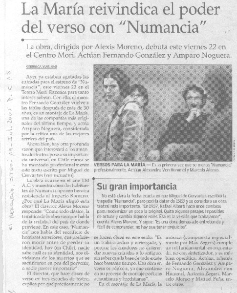 La María reivindica el poder del verso con "Numancia". [artículo] Marinao, Verónica