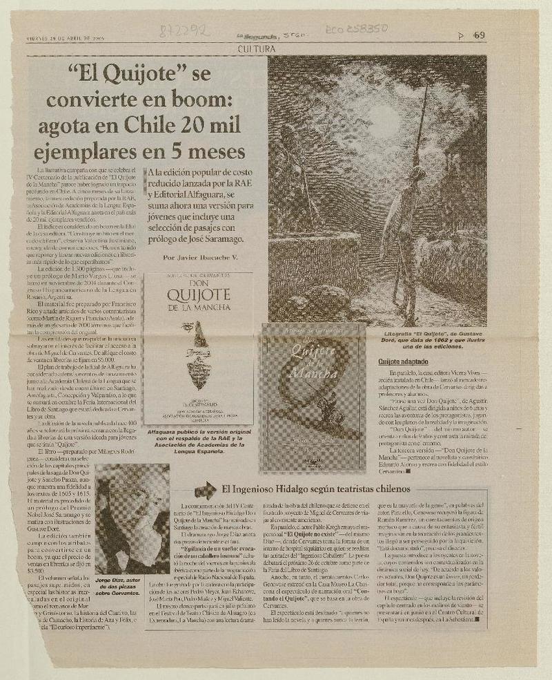 El Quijote se convierte en boom : agota en Chile 20 mil ejemplares en 5 meses [artículo] Javier Ibacache V.