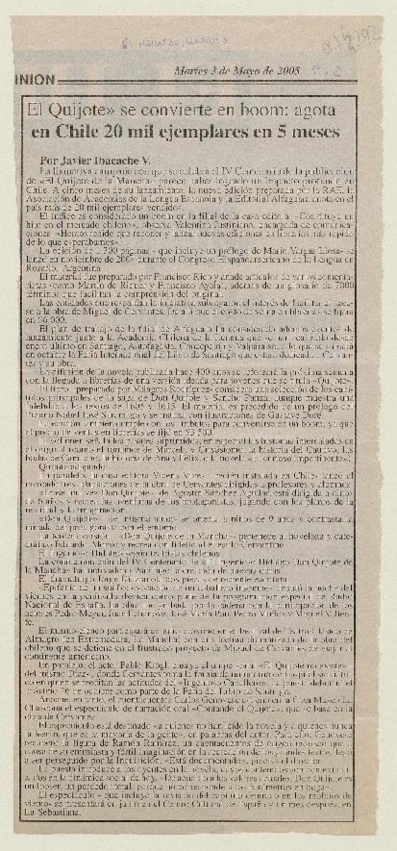 "El Quijote" se convierte en boom: agota en Chile 20 mil ejemplares en 5 meses. [artículo] Javier Ibacache V.