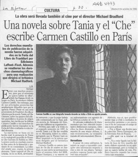 Una novela sobre Tania y el "Che" escribe Carmen Castillo en París [artículo] L. N.