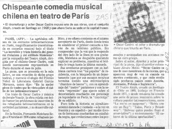 Chispeante comedia musical chilena en teatro de París [artículo].