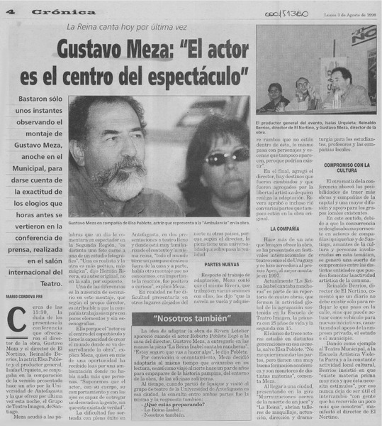 Gustavo Meza, "El actor, es el centro del espectáculo" [artículo] Mario Córdova Fre.