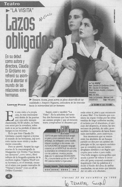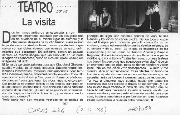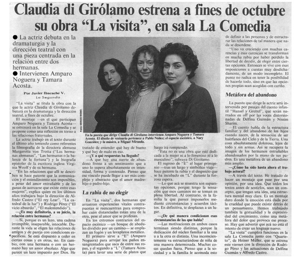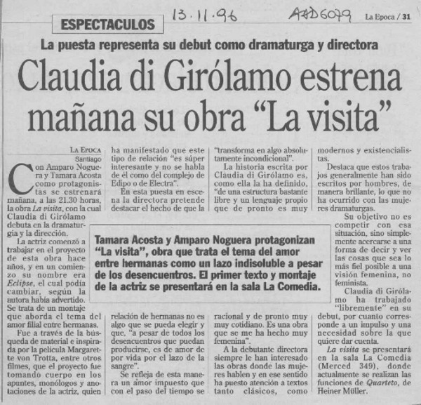 Claudia Di Girolamo estrena a fines de octobre su obra "La visita" [artículo] Javier Ibacache V.