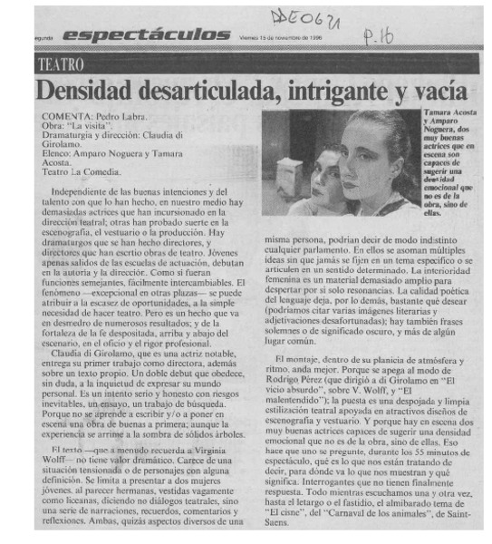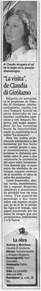 Claudia Di Girolamo estrena mañana su obra "La visita" [artículo].