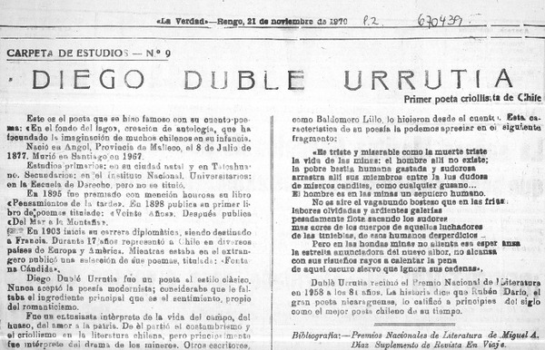 A 111 años de su nacimiento, el poeta Diego Dublé Urrutia [artículo] Carlos Ruiz Zaldívar.