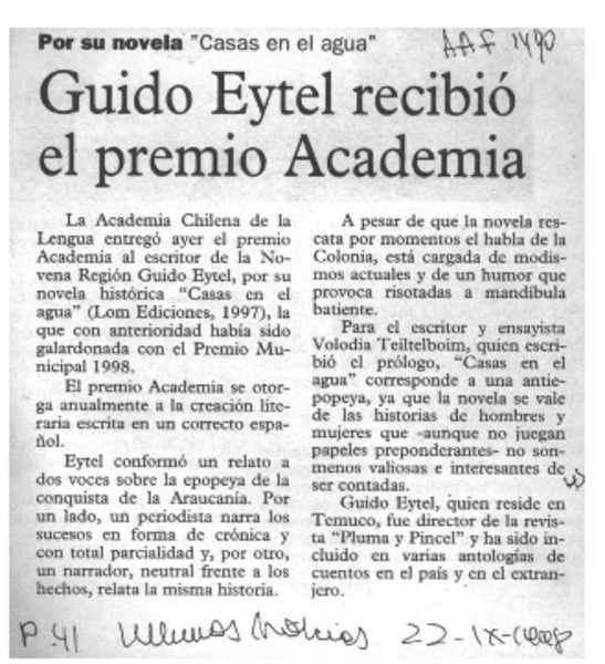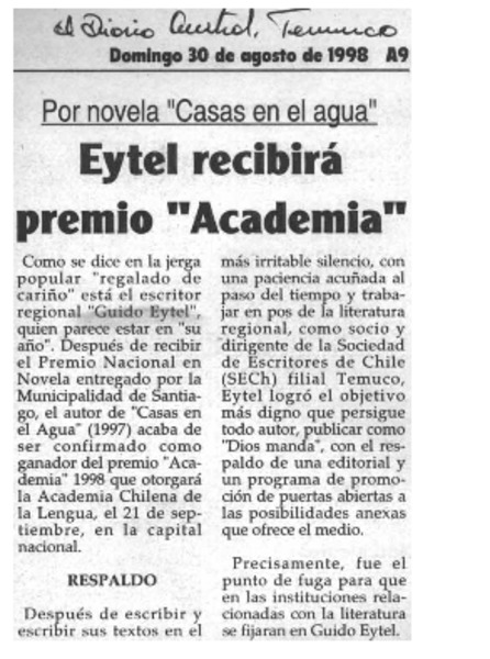 Eytel recibirá premio "Academia" [artículo].
