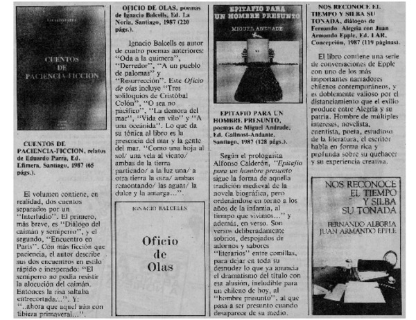 Parra, Eduardo - Alegría, Fernando - Epple, Juan Armando - Andrade, Miguel - Epitafio para un hombre presunto - Balcells, Ignacio - Nos reconoce el tiempo y silba su tonada - Oficio de olas - Cuentos de paciencia-ficción