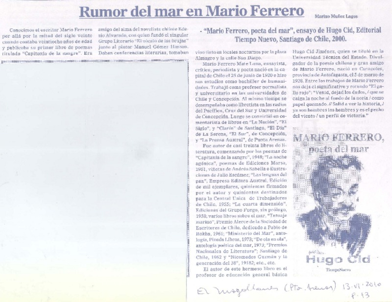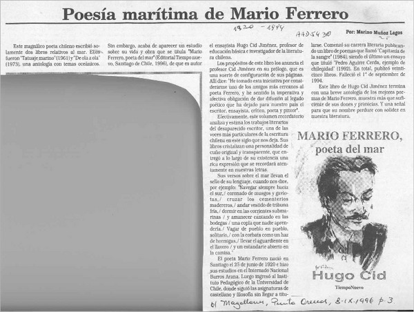 Autores chilenos - Cid Jiménez, Hugo Marcos - Ferrero, Mario - Mario Ferrero, poeta del mar