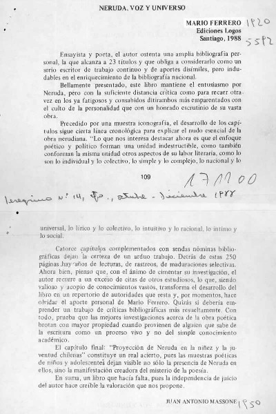 Neruda, voz y universo [artículo] Juan Antonio Massone.