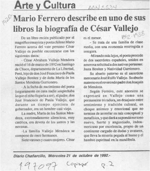 Mario Ferrero describe en uno de sus libros la biografía de César Vallejo [artículo].