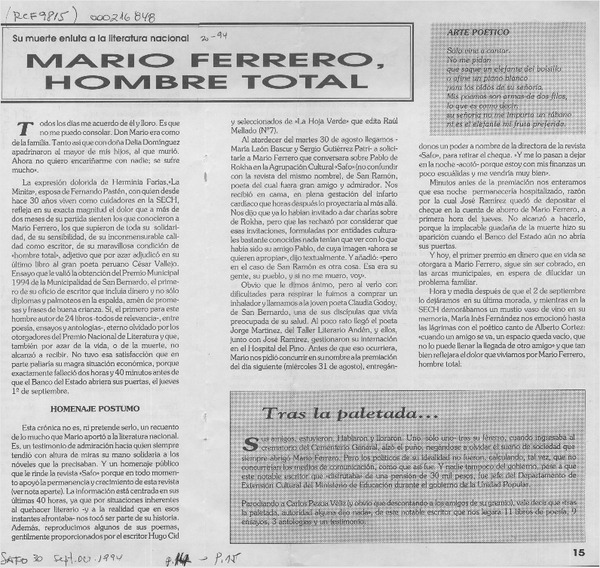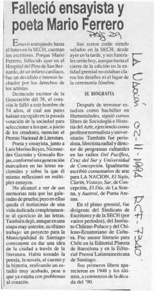 Murió conocido escritor, poeta y ensayista nacional Mario ferrero [artículo].