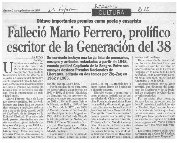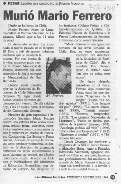 Muerte de Mario Ferrero [artículo] Marino Muñoz Lagos.