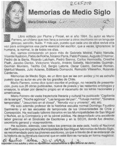 Memorias de medio siglo [artículo] María Cristina Aliaga.