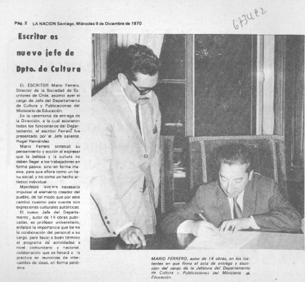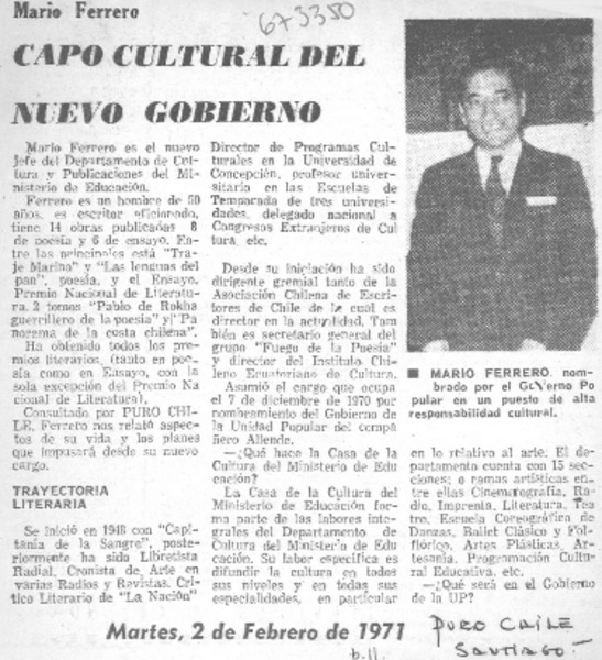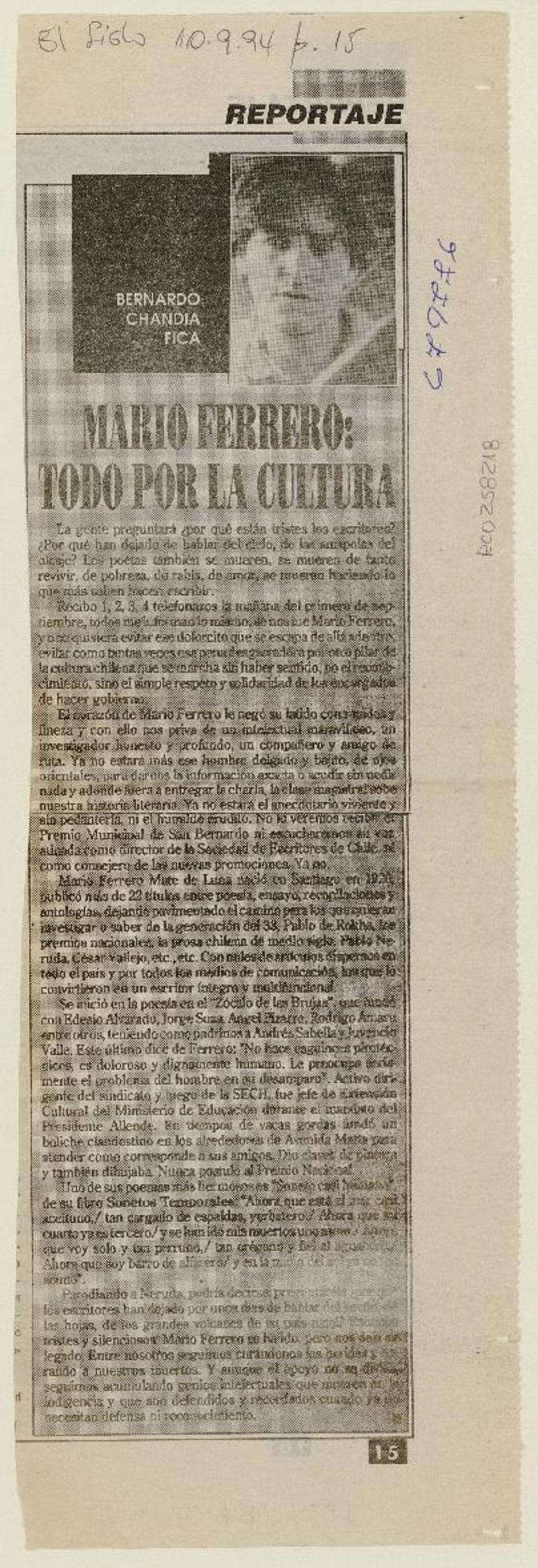 Mario Ferrero, todo por la cultura [artículo] Bernardo Chandía Fica.