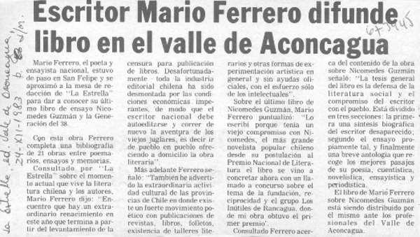 Escritor Mario Ferrero difunde libro en el valle de Aconcagua. [artículo]
