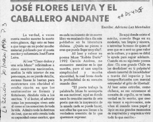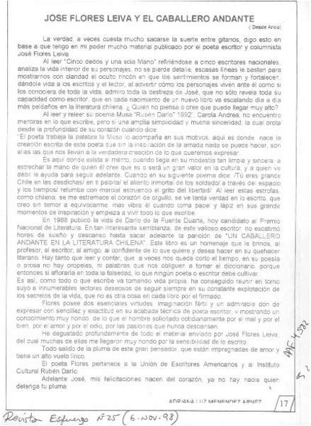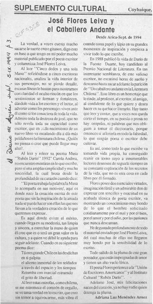 José Flores Leiva y el caballero andante [artículo] Adriana Luz Menéndez.