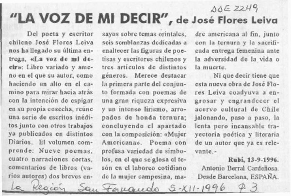 "La voz de mi decir", de José Flores Leiva [artículo] Antonio Berral Cardeñosa.