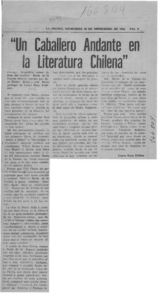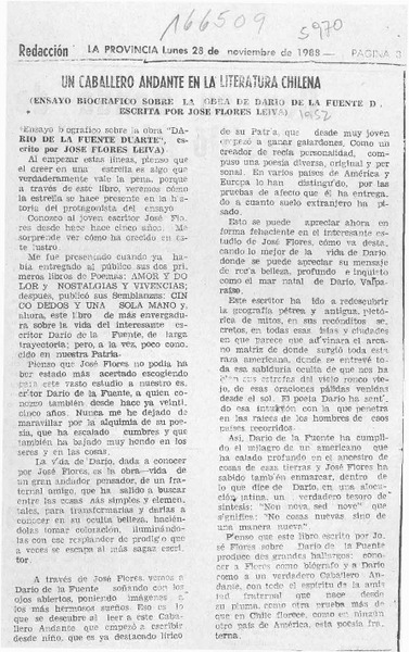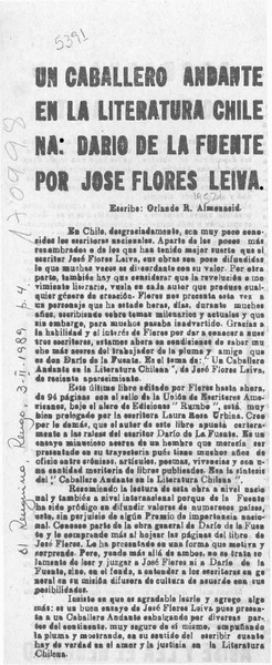 Un caballero andante en la literatura chilena, Darío de la Fuente por José Flores Leiva [artículo] Orlando R. Almonacid.