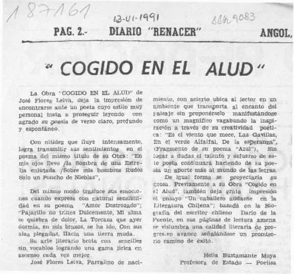 Impresiones sobre "Cogido en el alud", poemas de José Flores L. [artículo] Antonio Rodas Sánchez.